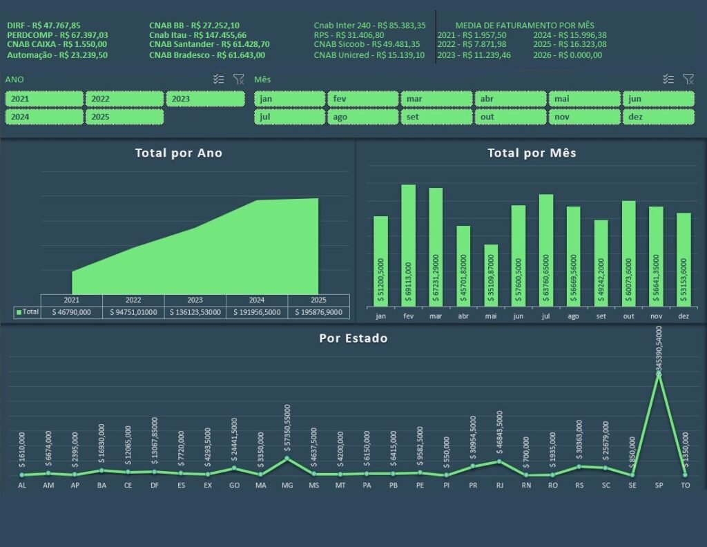 Especialistas com mais de 10 anos de experiência em automação de processos empresariais e desenvolvimento de soluções para manipulação de arquivos para importação em sistemas. Conhecidos pela criação de planilhas personalizados para gerar arquivos (.txt, .rem, .pdf, .ret, …) e integrar sistemas, atendendo a demandas como DIRF, SPED, CNAB, DMED, DIMOB, Carner Leão, Prefeituras e outros. Além de desenvolver soluções sob medida, oferece consultoria e suporte técnico online, garantindo que seus clientes maximizem a eficiência. Utilizando ferramentas avançadas como VBA, Excel, Power BI, Phyton, SQL, Google Planilhas e JavaScript, proporcionando soluções tecnológicas completas para empresas que buscam otimização e inovação.